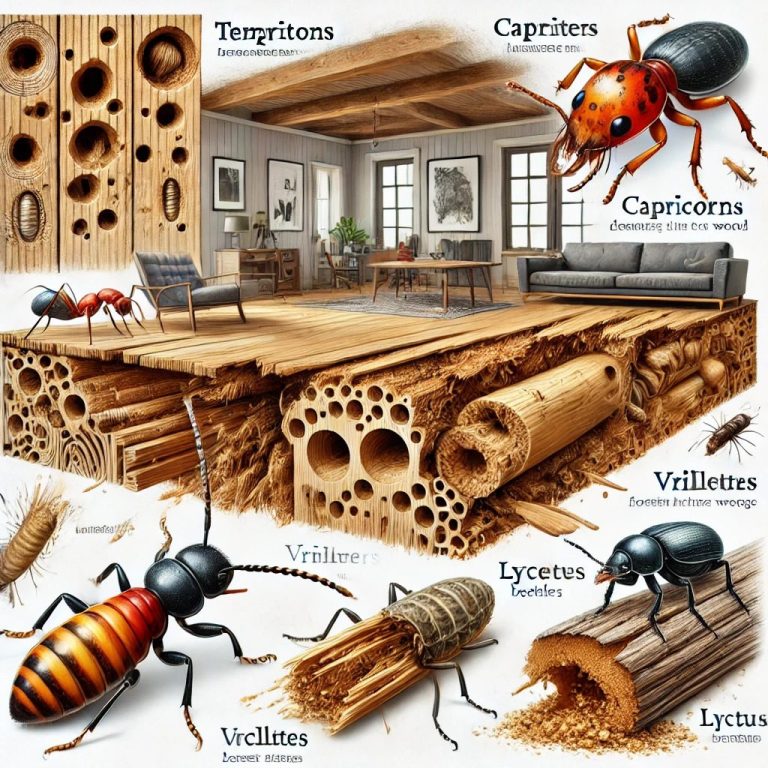 Les coléoptères à larves xylophages (notamment Hylotrupes bajulus – capricorne des maisons, Lyctus brunneus – lyctus, Anobium punctatum – vrillette, ou encore les siricidés tels que le sirex).