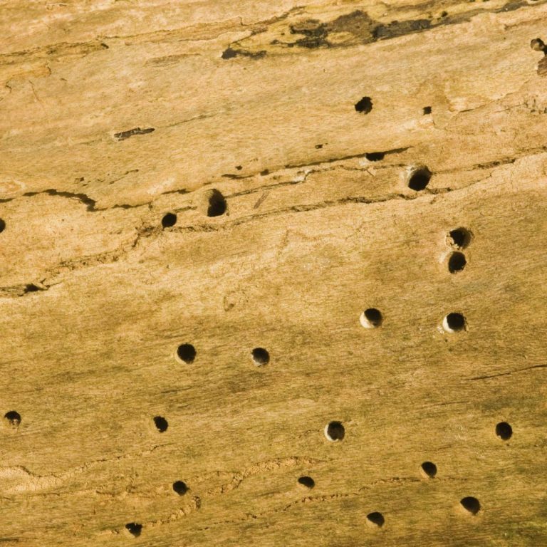 - trous de sortie parfaitement ronds (1 à 4 mm pour la petite vrillette, jusqu’à 6 mm pour la grosse).